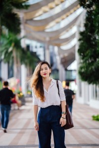 She wore a green blouse and a denim skirt and mary jane style shoes. She came in.